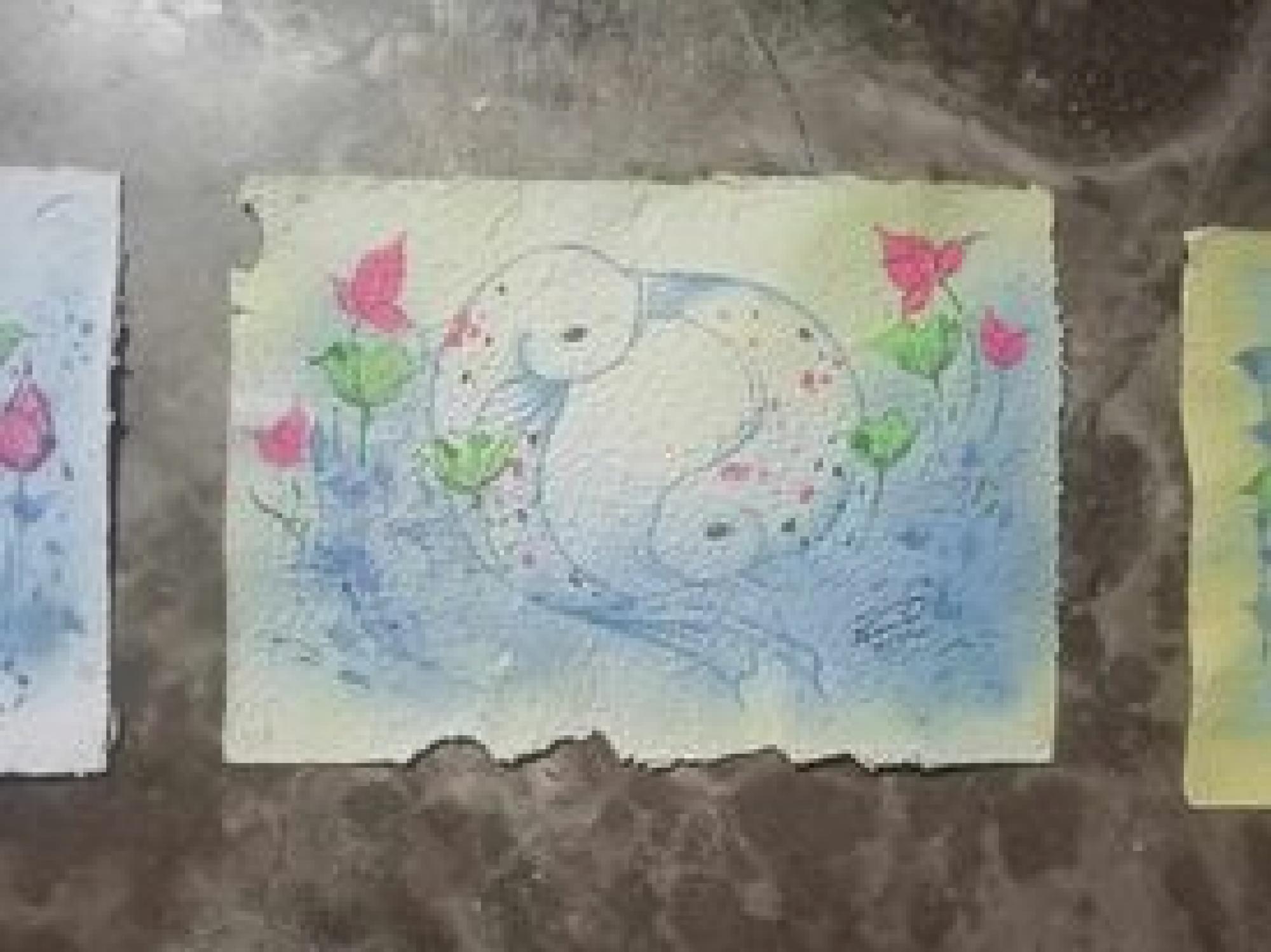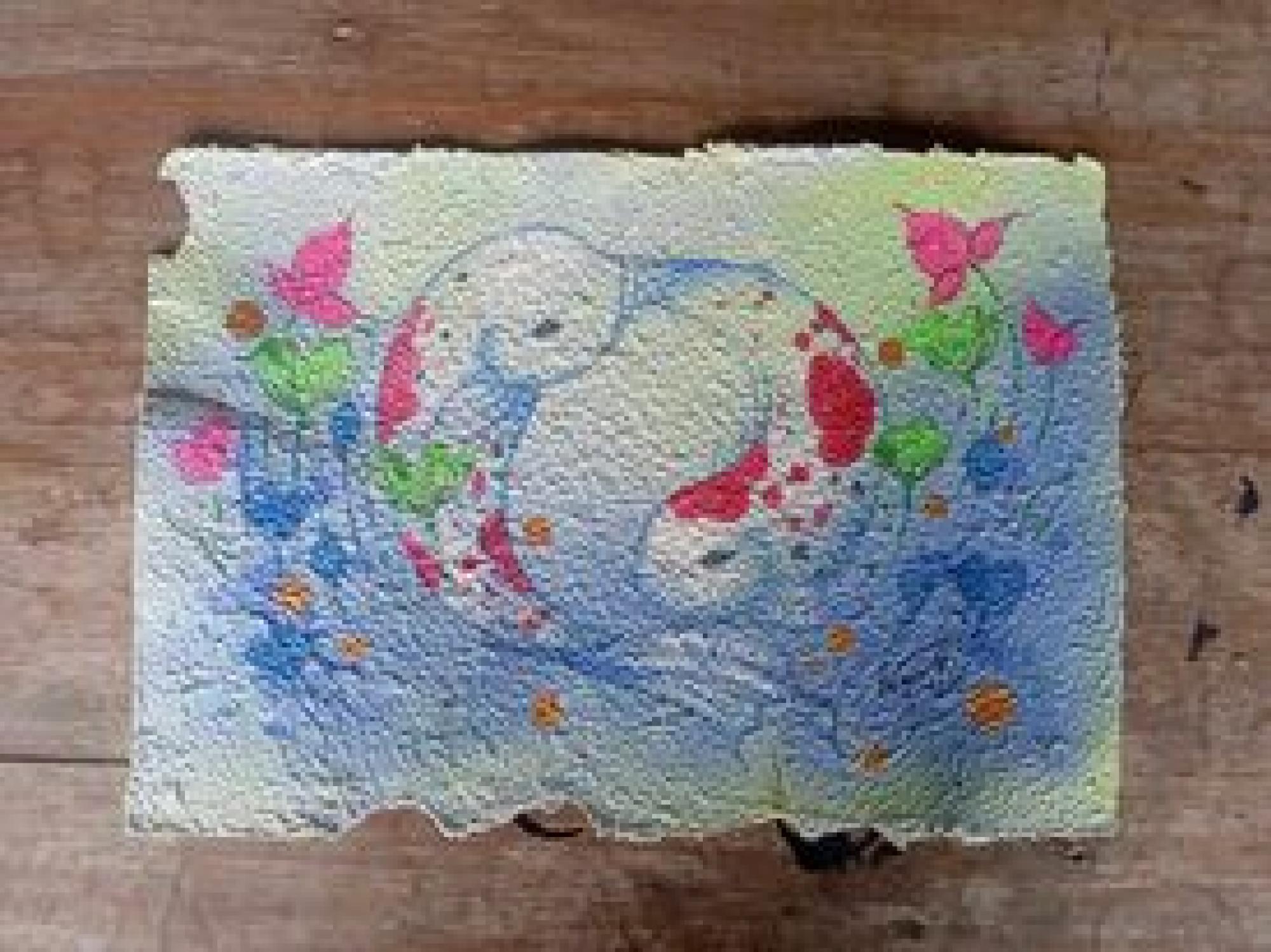 ๕. นำกระดาษสาและผ้ามัดย้อมที่ได้จากสีธรรมชาติ มาออกแบบสร้างสรรค์ชิ้นงาน เป็นภาพวาดและกระเป๋าลดโลกร้อน